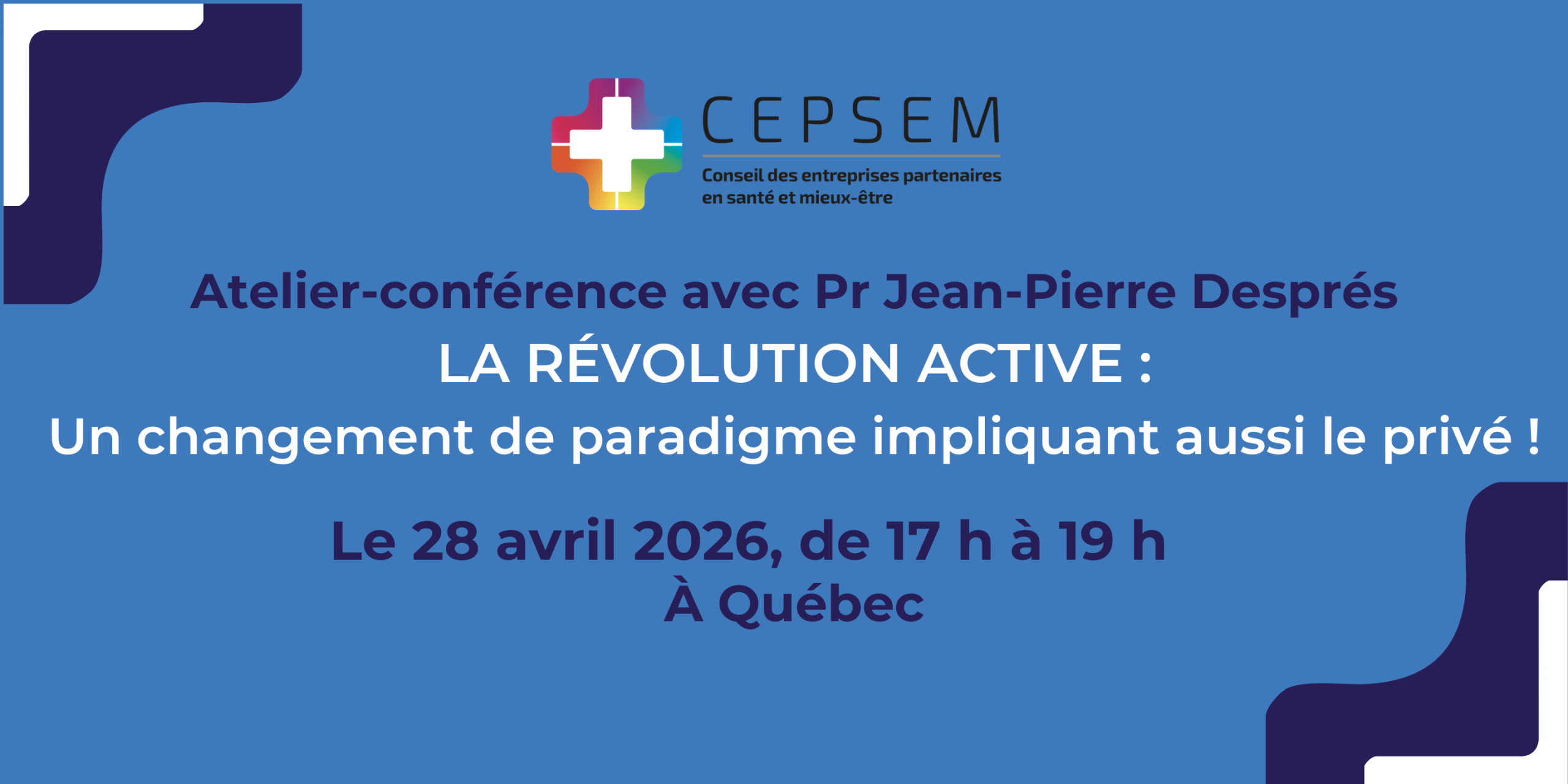 Dans le cadre de cet atelier-conférence du CEPSEM, Jean-Pierre Després présentera sa vision appuyée par de nombreuses études et données probantes, et engagera un dialogue et des échanges inspirants avec les participants, sur le rôle et la contribution du secteur privé dans ce changement de paradigme et cette ‘’révolution active’’ qu’il promeut.